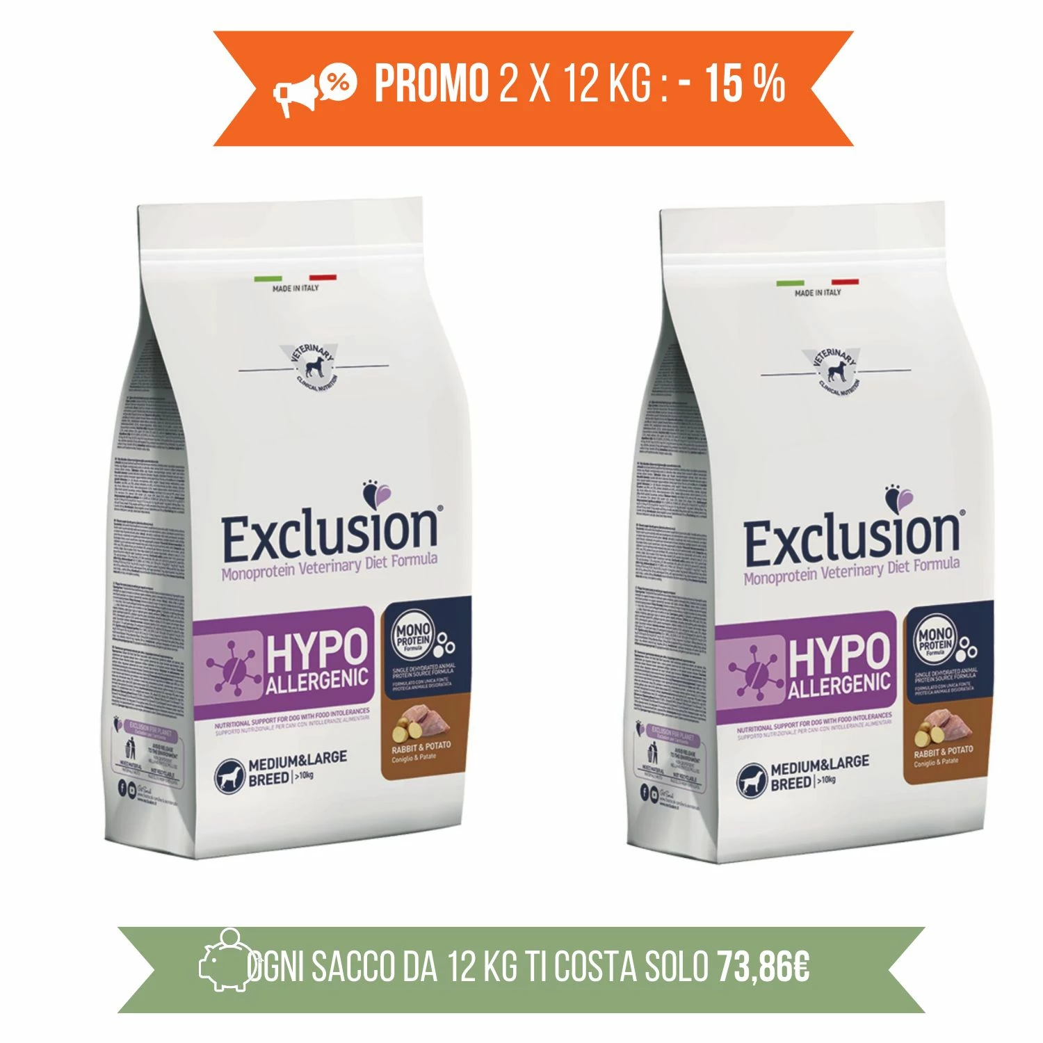 Exclusion Diet Hypoallergenic Medium Large Coniglio e Patate per Cani, alimento completo dietetico con formulazione monoproteica animale per cani taglia media-grande (peso corporeo >10kg) con intolleranza alimentare.