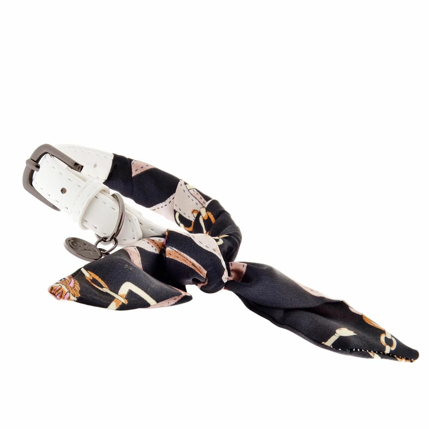 .Collare in eco pelle Bianco con agganciato foulard in seta nero con fantasia.