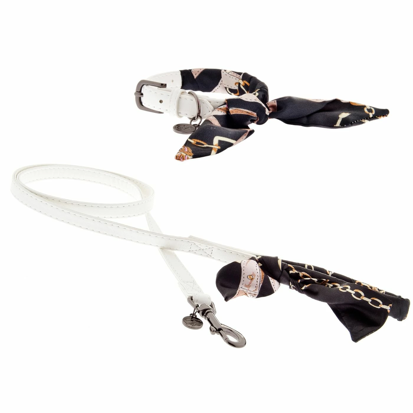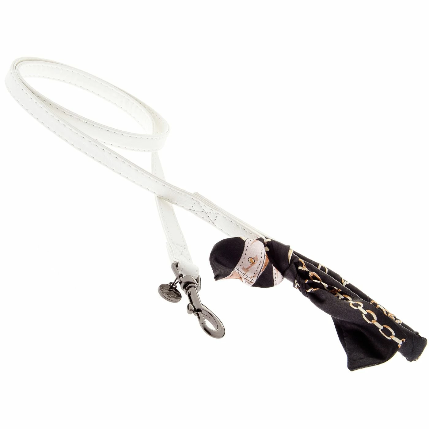 .Guinzaglio eco pelle Bianco con agganciato nella maniglia un foulard in seta nero con fantasia.