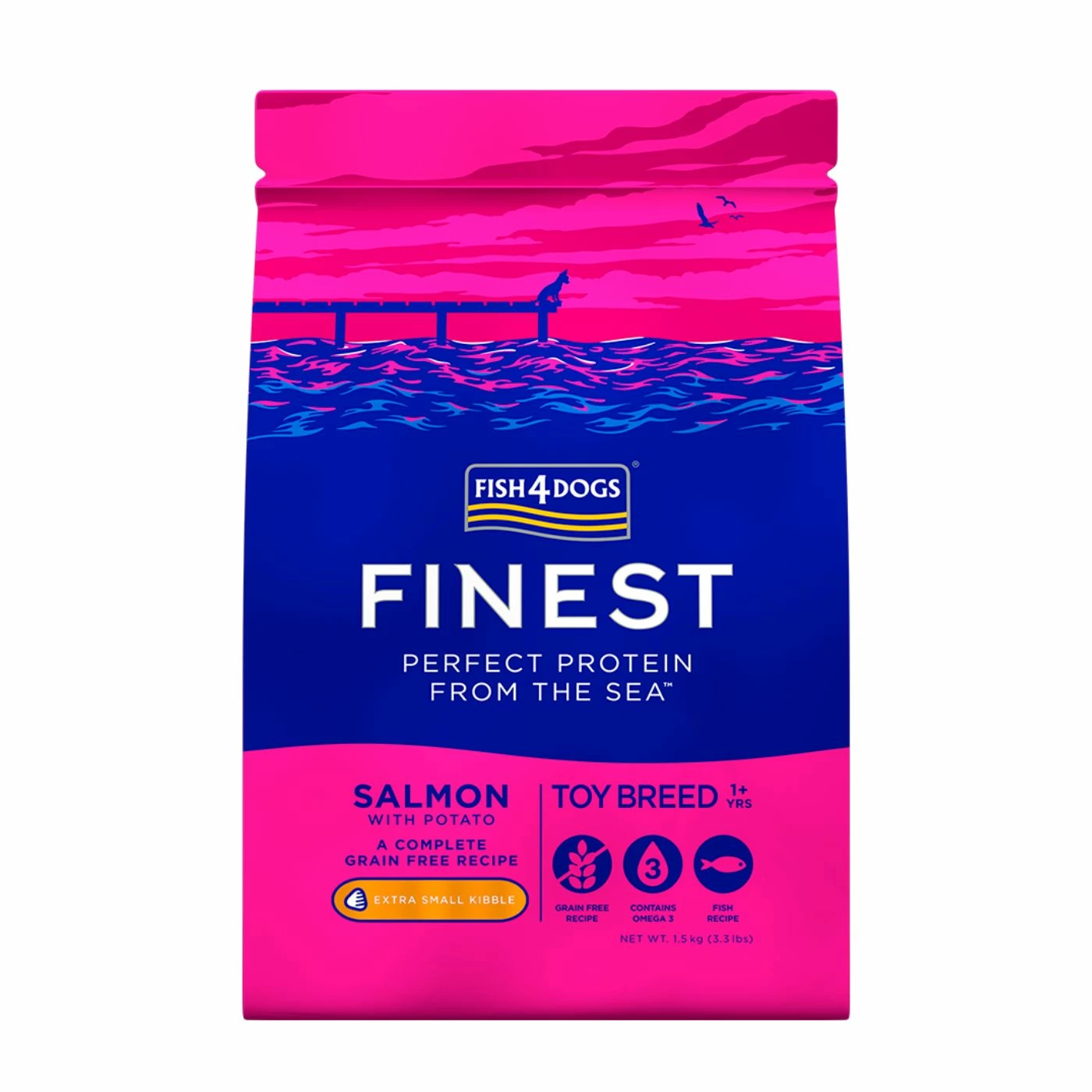 Fish4Dogs Finest Salmon Toy Breed Extra Small 1,5 Kg è un alimento completo e naturale per Cani Adulti di Taglia Molto Piccola che offre una maggiore energia e livelli più alti di proteine e olio, in linea con le maggiori esigenze caloriche.