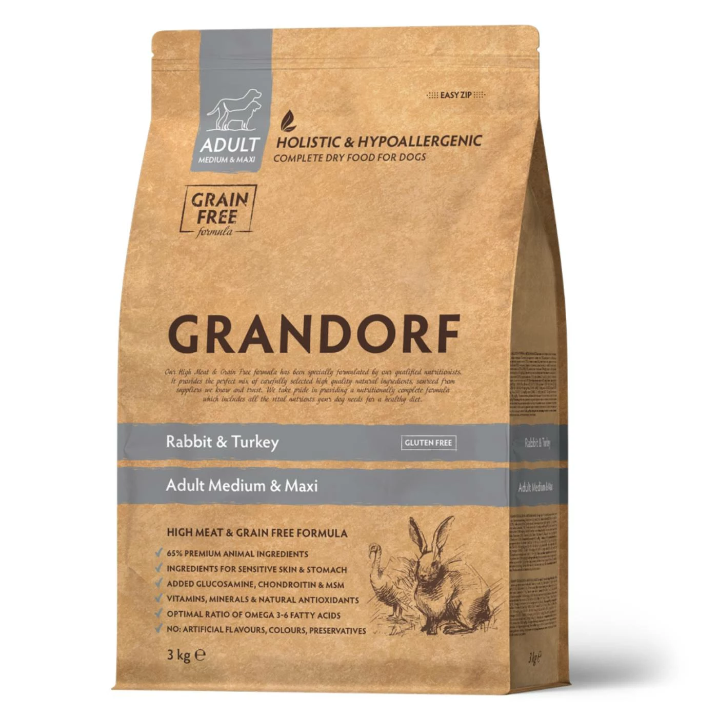 Grandorf Adult Grain Free Coniglio e Tacchino Medium & Maxi per Cani Adulti è ideale per cani di tutte le taglie da 1 anno e oltre, ma anche ideale per cani con digestione sensibile o soggetti ad allergie.