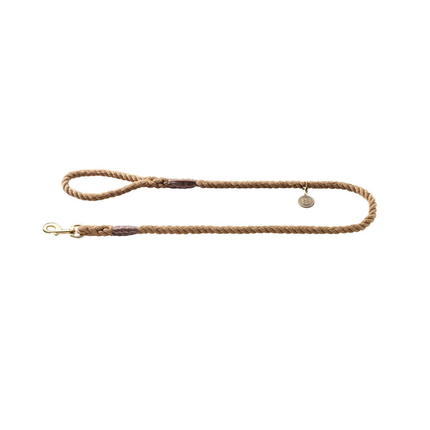 Deve il suo particolare tocco al design e ai materiali: il guinzaglio è composto da una corda e una pelle robuste, mentre i raccordi metallici (moschettone e pendente decorativo) sono in ottone.