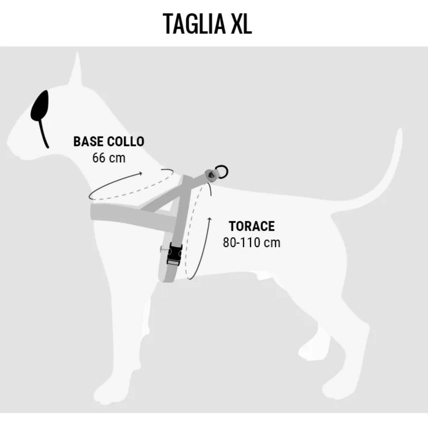L’imbracatura è studiata per non sollecitare le articolazioni anteriori e si indossa facilmente senza sollevare le zampe del cane: come un abbraccio.