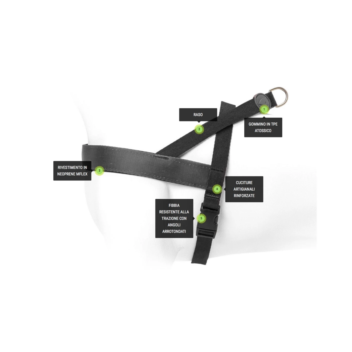 L’imbracatura è studiata per non sollecitare le articolazioni anteriori e si indossa facilmente senza sollevare le zampe del cane: come un abbraccio.