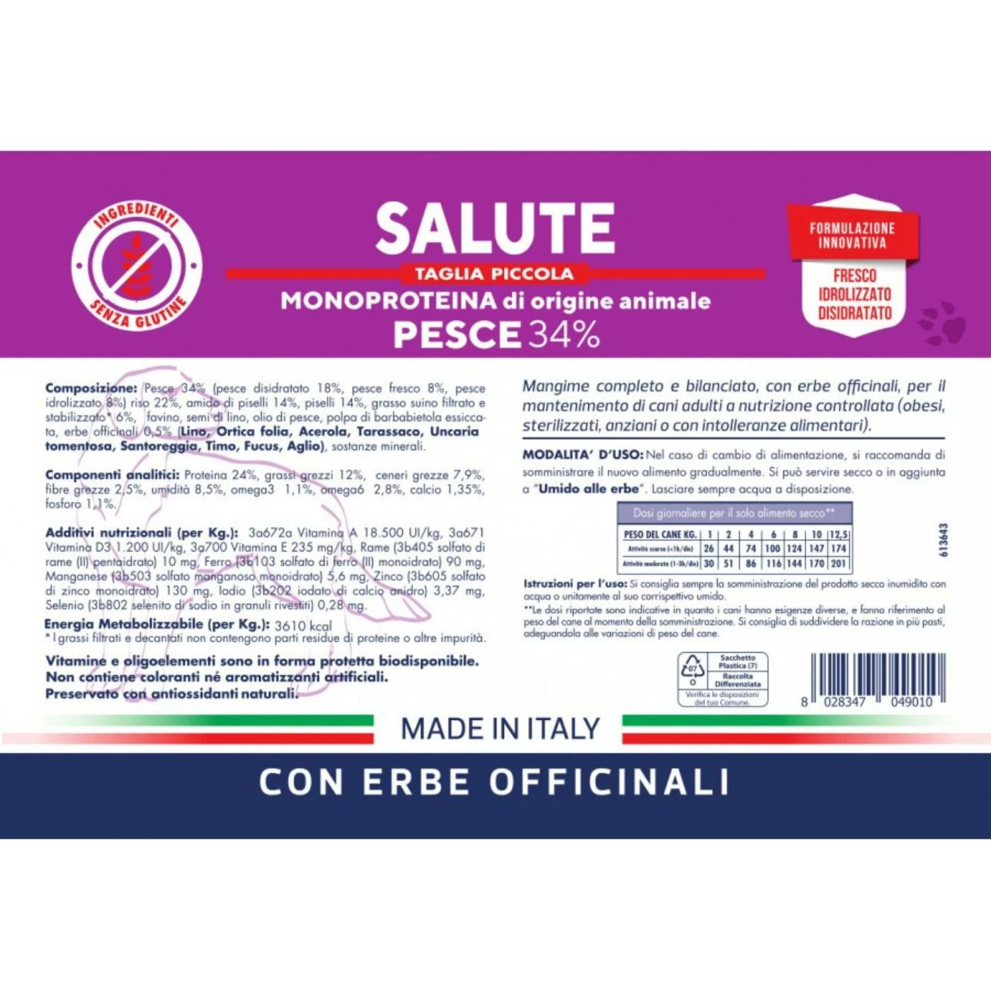 Vet Line Linea Salute Pesce Taglia Piccola per Cani Adulti VetLine è un mangime secco completo e bilanciato, con erbe officinali, studiato per il mantenimento di cani adulti a nutrizione controllata (obesi, anziani o con intolleranze alimentari).
