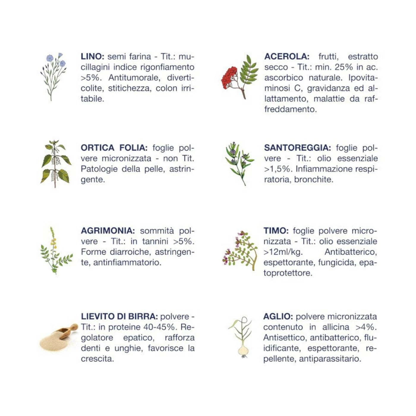 .erbe officinali (0,5%) (Lino, Ortica Folia, Agrimonia, Lievito di birra, Acerola, Santoreggia, Timo, Aglio)