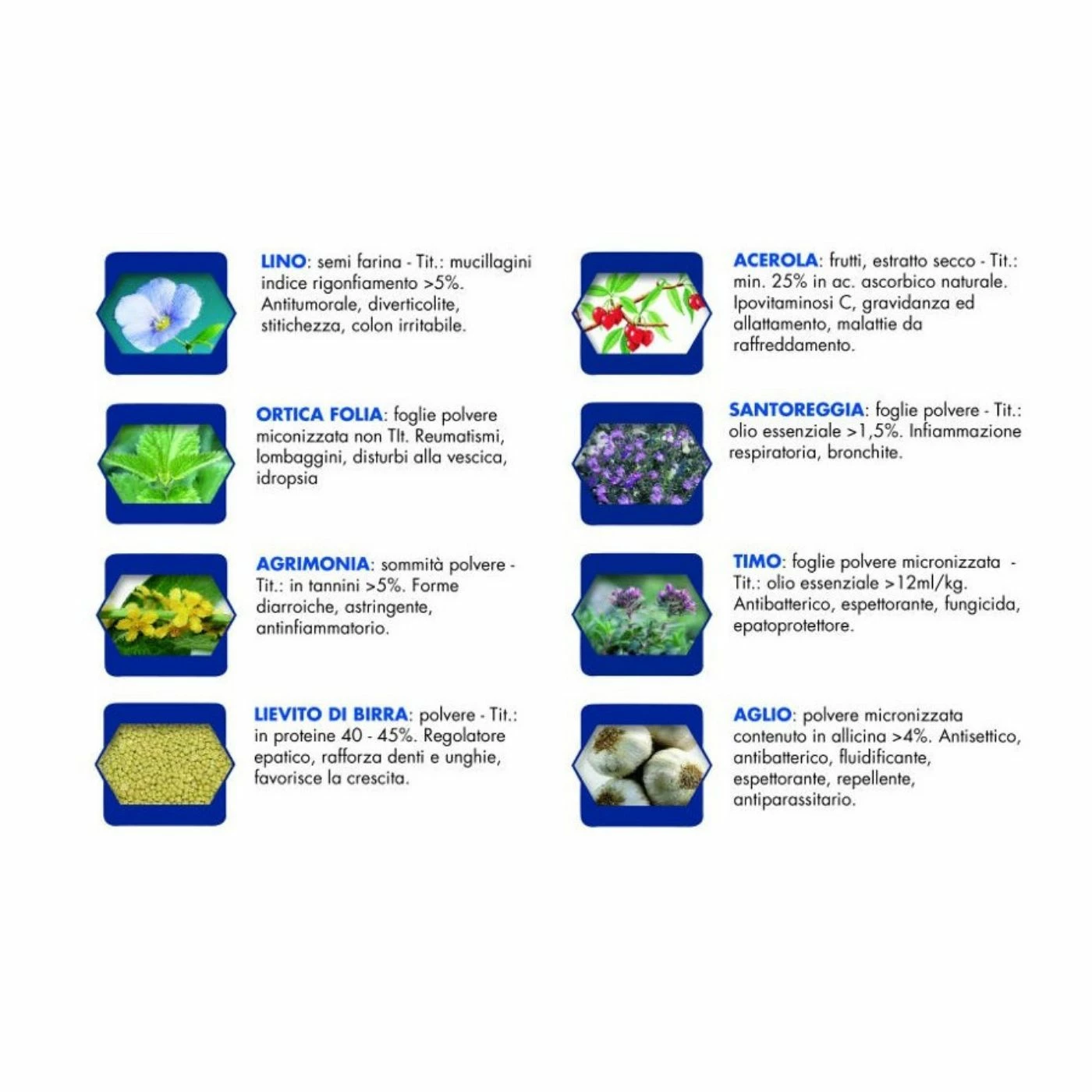erbe officinali 0,5% (Lino, Ortica Folia, Agrimonia, Lievito di birra, Acerola, Santoreggia Timo, Aglio)